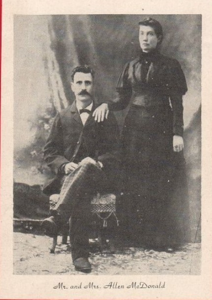 On November 23, 1931, there passed away at her home in Melvin, Texas, a daughter of Texas, whose life span of seventy years had been filled with tragedy and sorrow. She was Mrs. Mahala McDonald, who was the victim of a terrible tragedy when she was five years old, being taken captive, with her mother and younger sister, by Indians, after her father had been killed by the savages. After being kept by the Indians for several months the mother and her two little daughters were rescued from their savage captors and returned to their people. Mahala grew to womanhood and married Allen McDonald, a fine young man of the Harper section. Ten children were born to them, only three of whom are living today. Their eldest son, Irvin, was killed in a hunting accident at the age of 14, the six other children died in infancy. The living children of Allen and Mahala McDonald are H. L. McDonald of Menard, Texas; L. C. McDonald of San Angelo, Texas; and A. L. McDonald of Owens, Texas. Allen McDonald was born on Spring Creek, in Gillespie county, May 16, 1861, and died at Melvin, Texas, May 30, 1932, aged 71. His wife, Mahala McDonald, was born in Spring Creek, Gillespie county, March 5, 1861, and died November 30, 1931, aged 70. The writer knew this pioneer couple quite well, and often talked with them about their early life on the frontier. The photograph of the couple, which appears on our cover page this month, was taken a few years after they were married, and was given to us by one of Mrs. McDonald's nieces, Mrs. E. E. Spencer, of Kerrville.
