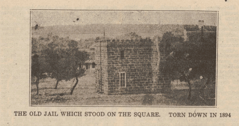 The first court house was finished in 1875 and was burned in 1877. Another court house was then built, a picture of which appears herewith. We believe that Whitmill Holland was the contractor who erected the second court house. This structure was torn down some fifteen or eighteen years ago, to be replaced by the present magnificent modern court house. A picture is also shown of the county jail which stood on the public square near the court house for many years. In 1894 this jail was torn down and a new jail was built on the south side of the public square.