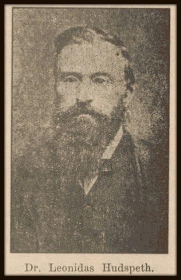 "Leonidas Hudspeth was born in Pickens county, Alabama, April 28th, A. D. 1833: At the age of about five years it was his misfortune to lose that best of all friends—a true, noble and loving mother. At the death of his mother he went to live with his grandfather, Capt. Aires Hudspeth, who removed to Lafayette county, Miss., where he died in January, A. D., 1842. At the death of his grandfather, Leonidas was taken by his uncle, Dr. Thomas G. Hudspeth of Panola county, Miss., where he remained until some time in 1854 when his father, Dr. Henry S. Hudspeth, who in the meantime had married again and moved to Drew county Ark., took him home, where he grew to manhood. At about the age of 20 he attended Bethel College at McLamoresville, Tenn., and finished up a liberal English education; after which he read medicine under his father, and in the winter of 1854 attended lectures at the New Orleans School of Medicine. In 1856 he came to Texas and settled at Hallettsville, Lavaca county, where he soon built up a lucrative practice. On the 18th day of November, 1858, he was married to Miss Kate M. Chambliss, daughter of Dr. Nathaniel Chambliss, of Lavaca county Texas.